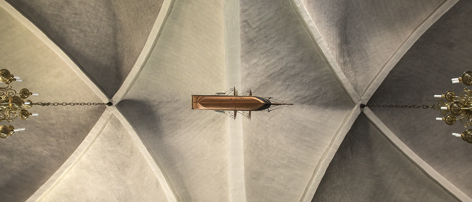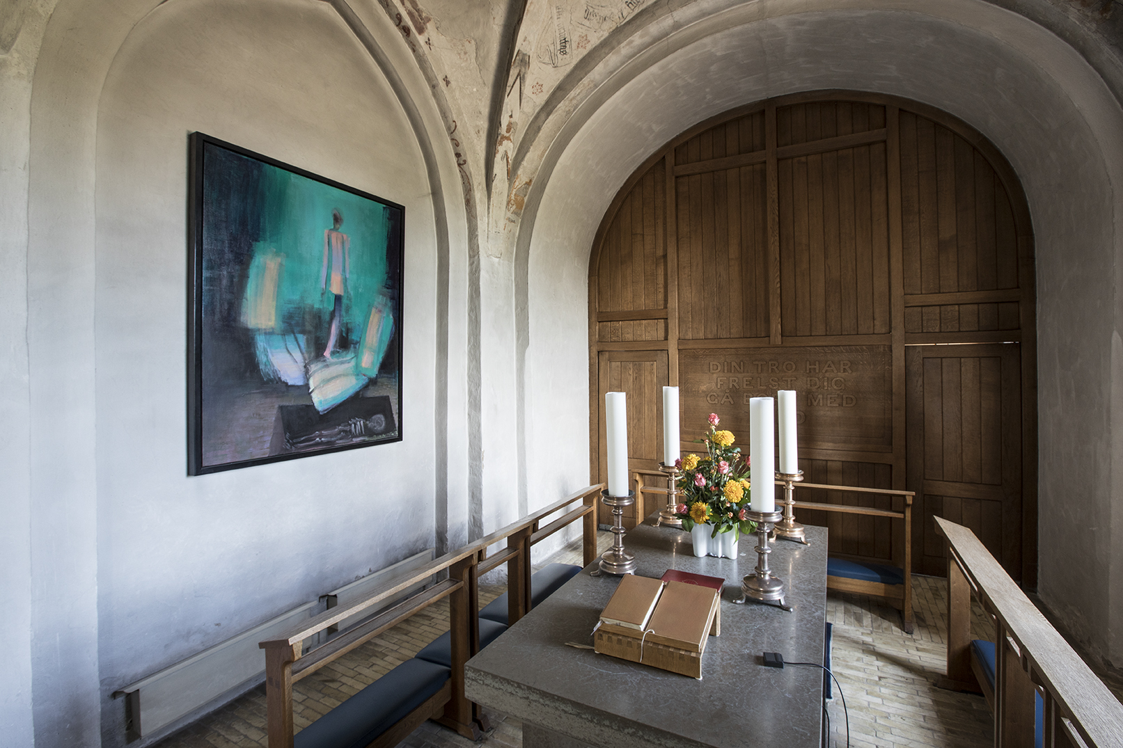 Huset bærer derfor præg af at have stået der i mange generationer: Kirken er fra cirka 1150, døbefonten fra 1300-tallet. Over det moderne kor hvælver sig kalkmalerier uden den store æstetisk værdi, bortset fra at være et postkort fra 1400-tallet. Kirkeskibet (det store kirkerum, red.) er et renæssancerum med smukt udskåret træværk i prædikestolen og med stolestader i træ foran et ret nøgternt udtryk i orglet, der er bygget, så man får glæde af vestvinduet. Men der mangler en arkitektonisk og æstetisk sammenhæng. Menighedsrådet arbejder på den, skulle jeg hilse og sige.