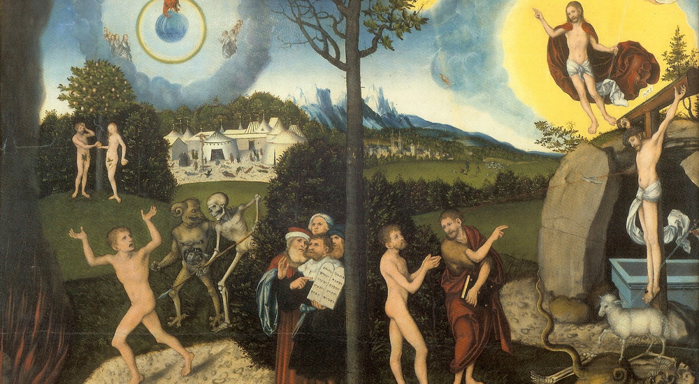 "Loven og nåden", Lucas Cracach d. Æ (1529). I midten: Livets Træ. Til venstre: Loven med Djævelen, Adam og Eva samt Moses med lovens tavler. Til højre: Nåden med Døberen, Guds lam og den opstandne Kristus.