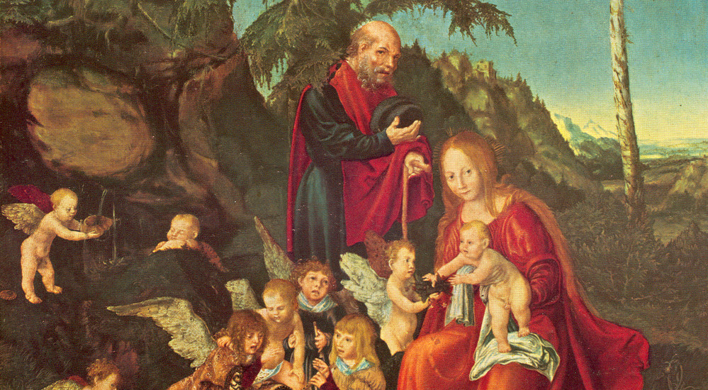 "Et hvil under flugten til Egypten", Lucas Cranach d. Ældre, 1504 (udsnit). Maria og Josef gør holdt omgivet af engle, mens de er på vej i eksil med det lille Jesusbarn.